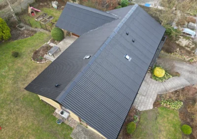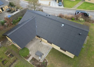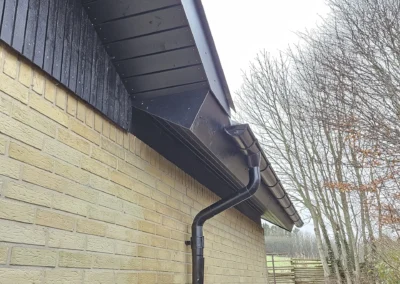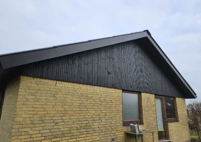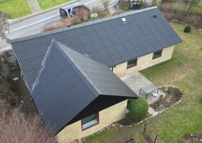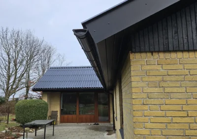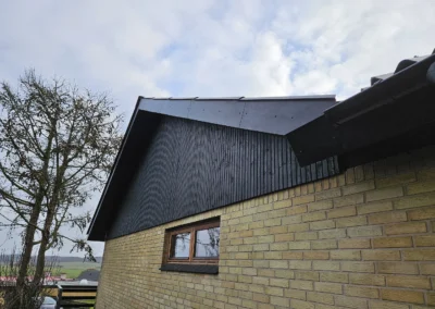 B6 Eternit “Komplet tagudskiftning med nye sorte udhæng, gavle, tagrender, blik og tagplader, samt 2 Velux lystunneler.”