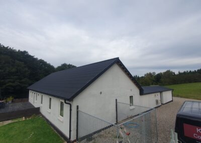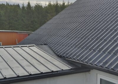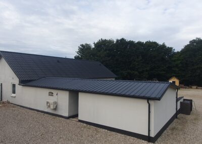 B7 og pandeplader Nyt tag med kombination af B7 tagplader på hus og pandepladetag på garage.En flot kombination med sorte udhæng og tagrender.
