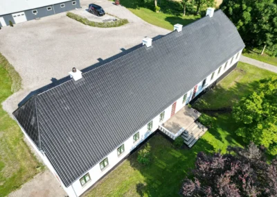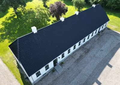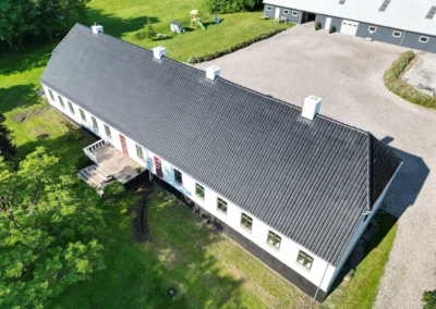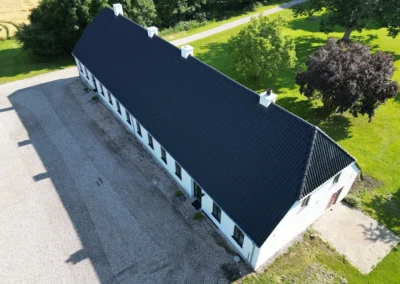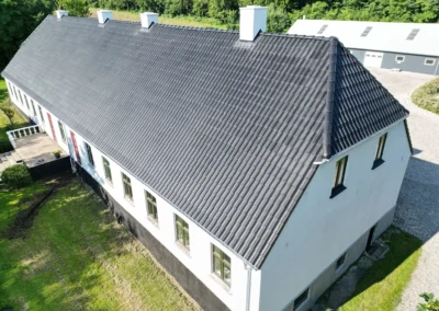 Betontagsten Udskiftning af bølgepladetag til nyt tag med betontagsten. Nyt isolering, 4 skorstensinddækninger og montering af 90 meter zink tagrender.
