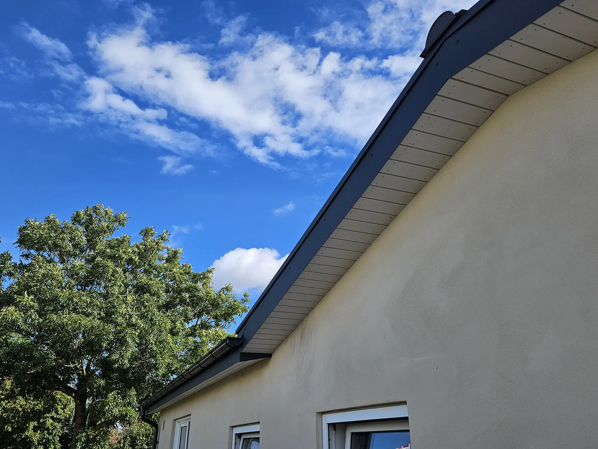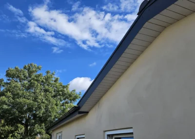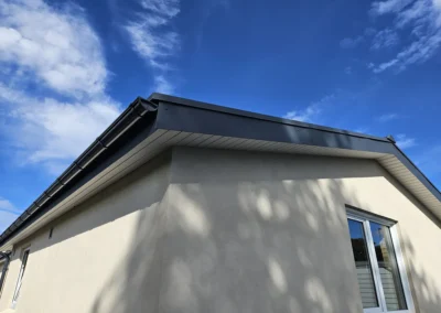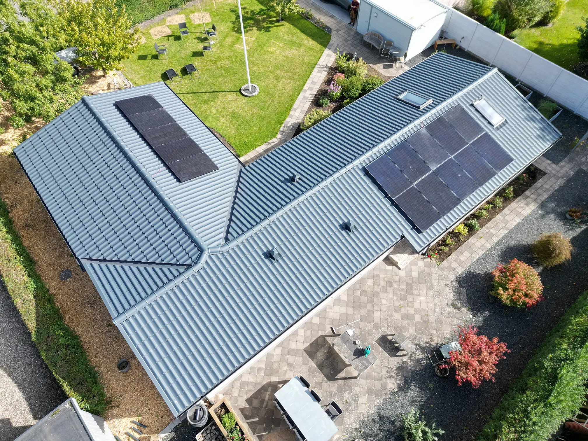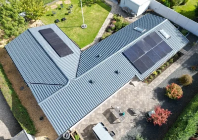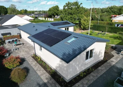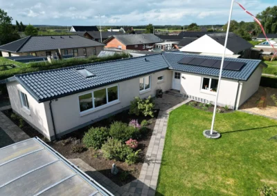 Stålpladetag med tagstensprofil Komplet tagudskiftning med etablering af 2 stk solcelledrevne Velux vinduer. Stern- og vindskedebeklædning udført af specialbukket indfarvet stål. Eksisterende solcelleanlæg af- og genmonteret.