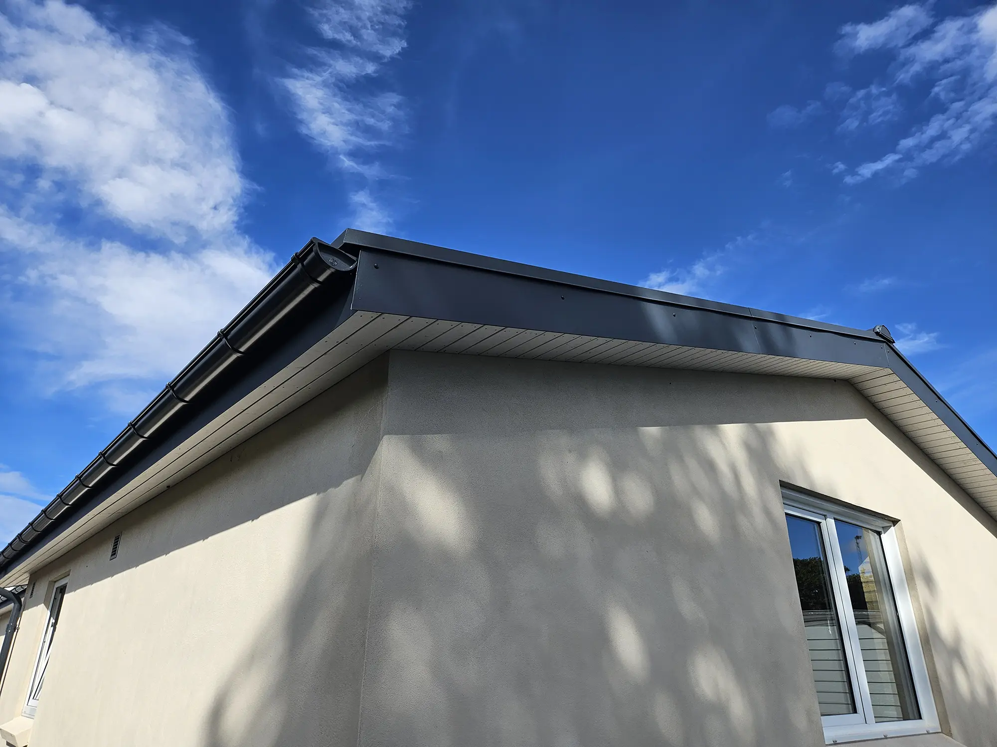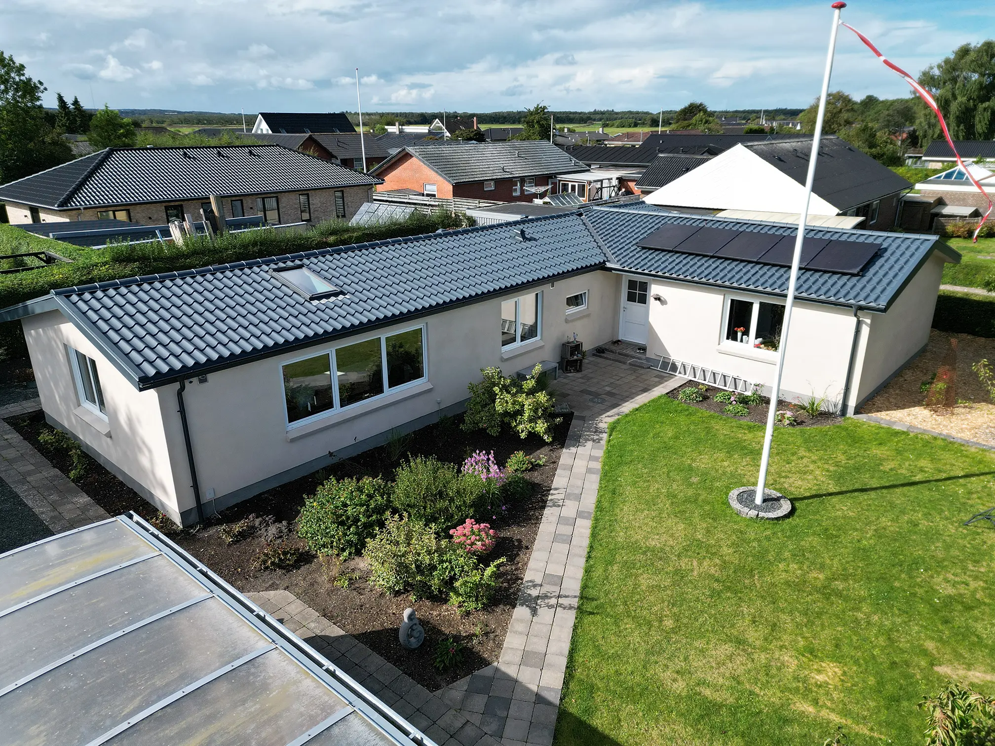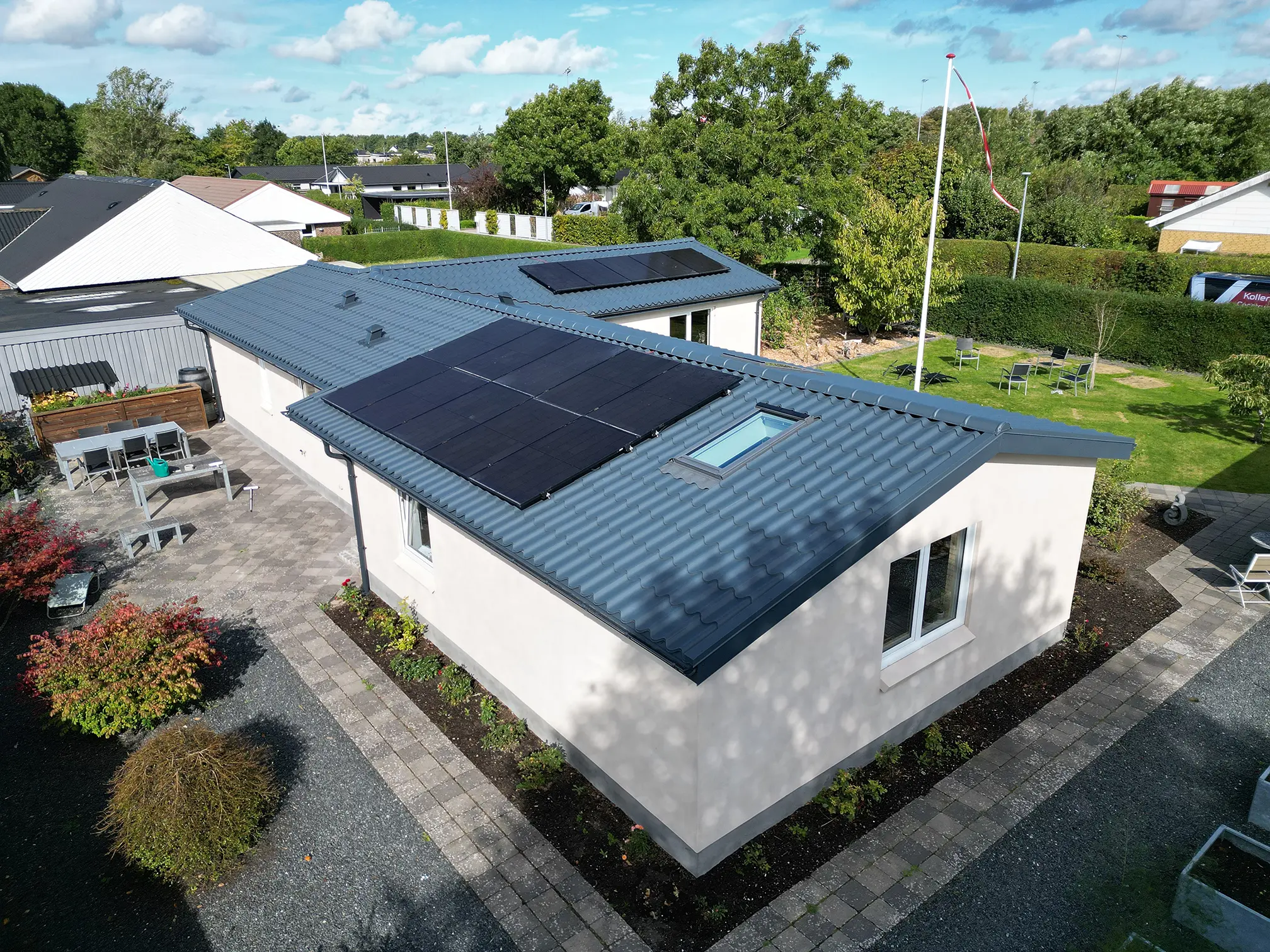 Stålpladetag med tagstensprofil Komplet tagudskiftning med etablering af 2 stk solcelledrevne Velux vinduer. Stern- og vindskedebeklædning udført af specialbukket indfarvet stål. Eksisterende solcelleanlæg af- og genmonteret.